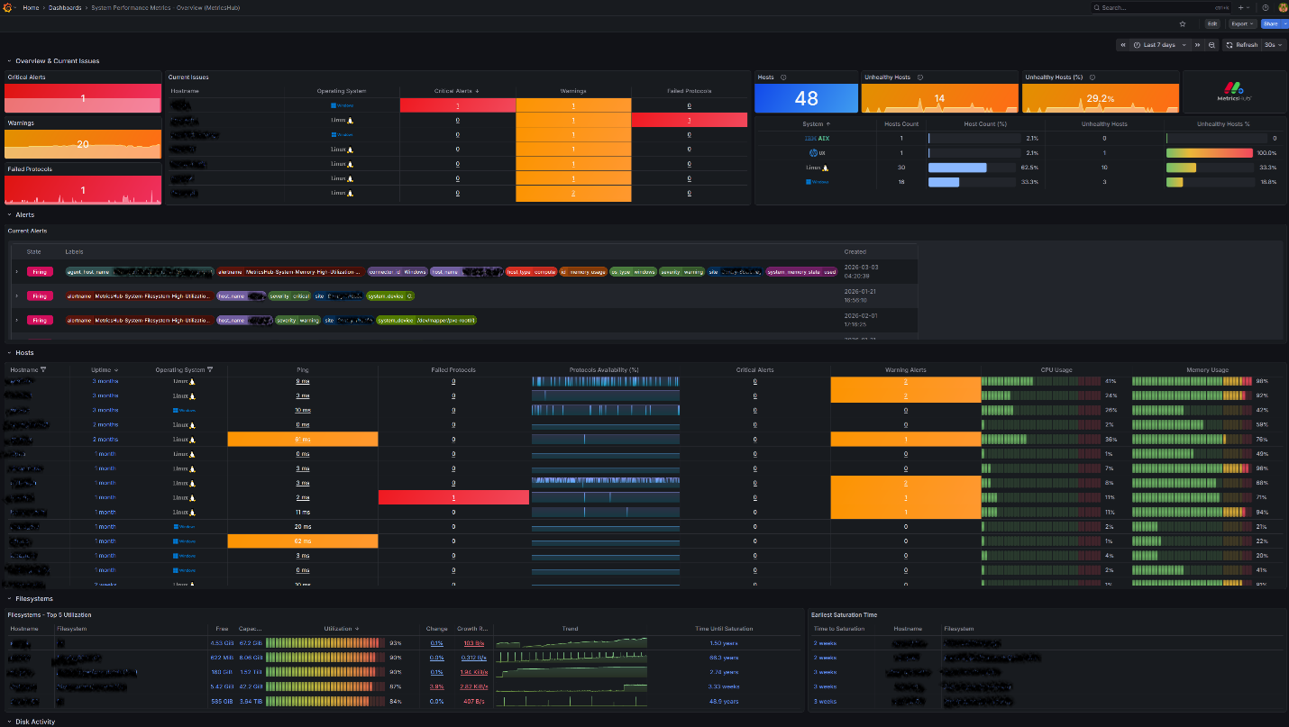 24972 | System Performance Metrics – Overview (MetricsHub) | Global system dashboard providing a consolidated view of system health and current issues across all monitored hosts. | Aggregated indicators across hosts, including alerts, protocol health, resource utilization (CPU, memory, storage, network), and OS distribution. | Use for situational awareness and triage. Ideal to quickly identify unhealthy systems and prioritize investigation across the infrastructure. |