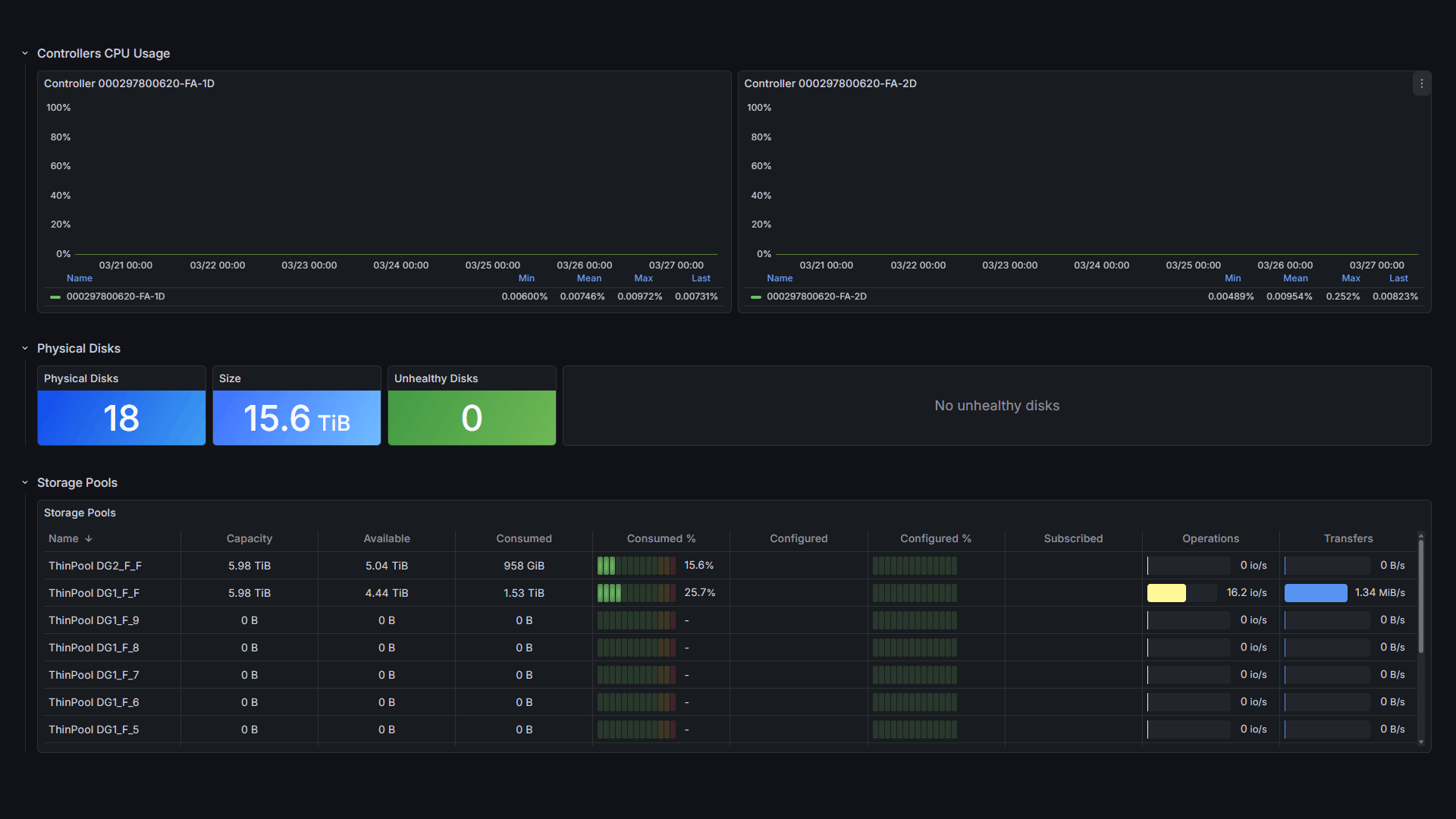 Monitor health, capacity, and performance across disks, volumes, and controllers. Track I/O, latency, usage, endurance, and environmental data.