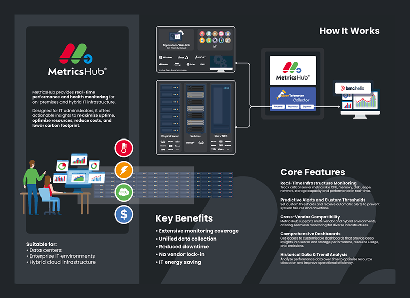 MetricsHub delivers deep, real-time insights into your infrastructure directly within BMC Helix. Monitor hardware health, system performance, and sustainability metrics across servers, storage, and network devices, so you can anticipate issues, control costs, and improve the efficiency of your data centers.